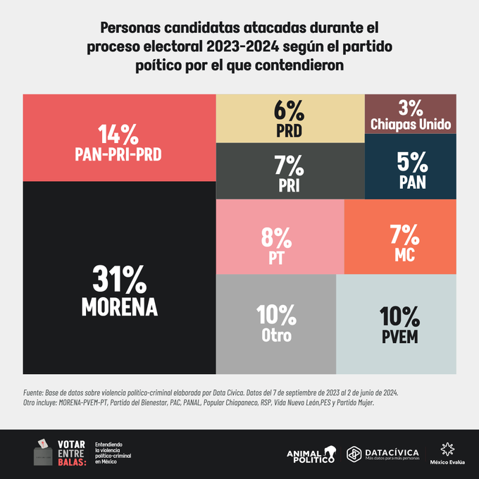 El proyecto Votar entre Balas: Entendiendo la violencia político criminal en México. Reporte durante el mes de mayo, el primero de junio y el día de la jornada electoral, de la organización Data Cívica, documentó que todos los partidos políticos fueron víctimas de este tipo de violencia, por lo que “es imposible sostener que hay una relación entre grupos de crimen organizado y un partido político en particular”.