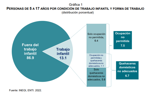 El Instituto Nacional de Estadística y Geografía (INEGI) apunta en la Encuesta Nacional de Trabajo Infantil (ENTI) 2022, que 3.7 millones de niñas, niños y adolescentes realizaron alguna actividad considerada como trabajo infantil, lo que representa el 13.1% de la población de 5 a 17 años.