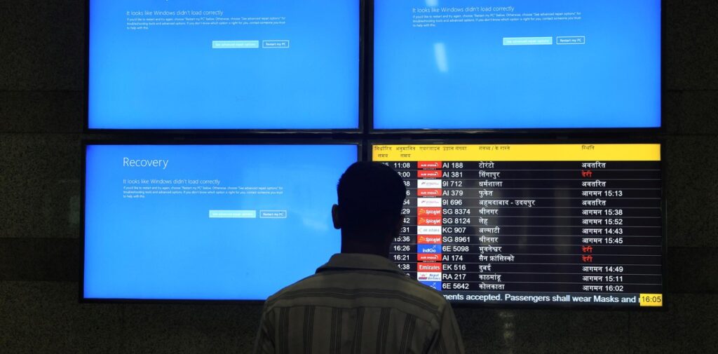 Ante la caída del sistema operativo de Windows en sus computadoras, los trabajadores de las aerolíneas en los aeropuertos más concurridos y grandes del mundo -Berlín, Ámsterdam, Los Ángeles y Singapur– registraban a los pasajeros en una lista hecha a mano. Todo eran largas filas de usuarios y pantallas con imágenes azules en lugar anuncios con las llegadas y salidas de vuelos.