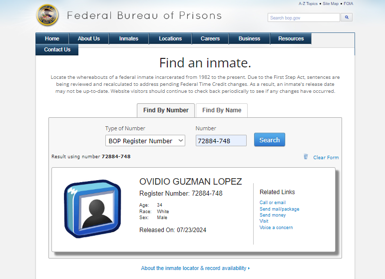 Según el portal del Buró Federal de Prisiones de Estados Unidos, Ovidio Guzmán López, hijo del Chapo, aparece registrado como liberado el 23 de julio del presente año.
