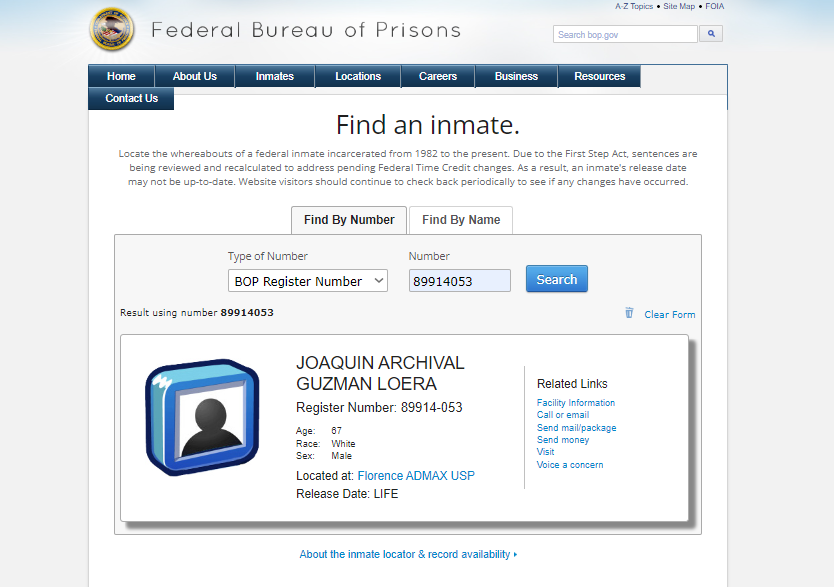 El prisionero con número 72884-748 no aparece como recluido ni se encuentra su ubicación en ninguno de los penales del país norteamericano, a diferencia de Joaquín Guzmán Loera, su padre, cuyo registro en el Buró Federal de Prisiones lo ubica en la prisión de máxima seguridad de Florence.