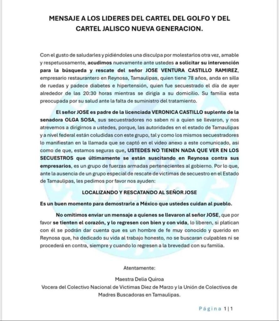 “… Acudimos a ustedes porque las autoridades de Tamaulipas y a nivel Federal están coludidos con este grupo, tal y como los mismos secuestradores manifiestan en una llamada que se captó en el vídeo anexo a este comunicado”.
