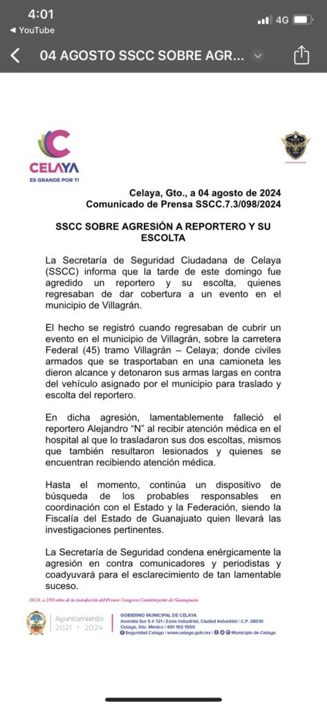 De acuerdo con la Secretaría de Seguridad Ciudadana de Celaya (SSCC), la tarde de este domingo cuando regresaban de cubrir un accidente en el municipio de Villagrán fueron agredidos con armas largas el periodista y uno de sus escoltas, que son polícias municipales.
