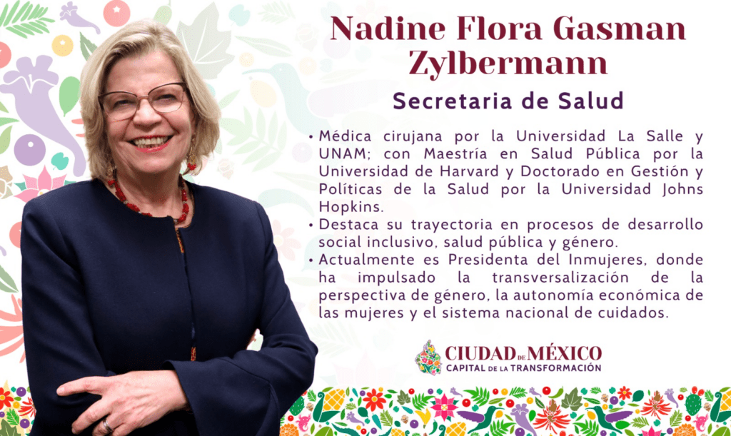 Nadine Flora Gasman Zylbermann, quien preside el Instituto Nacional de las Mujeres (Inmujeres), será la nueva titular de la Secretaría de Salud de la CDMX. En 2022 fue postulada para dirigir la Organización Panamericana de la Salud (OPS), pero no le alcanzó la votación obtenida al seno de esa organización. Fue derrotada por el brasileño Jarbas Barbosa da Silva Jr.