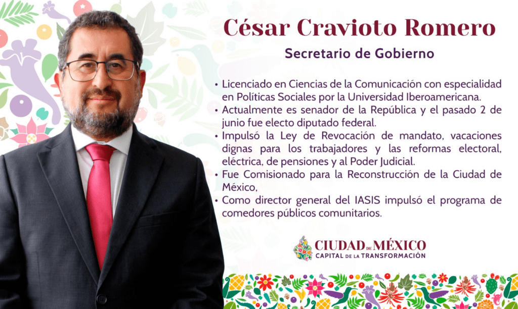 Clara Brugada se decantó por César Cravioto Romero para dirigir la Secretaría de Gobierno de la CDMX. El saliente senador y diputado federal de Morena fue integrante del gabinete de AMLO cuando era jefe de Gobierno; de 2001 a 2005 se desempeñó como director de Concertación Política, y en 2007 fue nombrado director del Instituto de Asistencia e Integración Social (IASIS), coordinada por la Secretaría de Desarrollo Social.