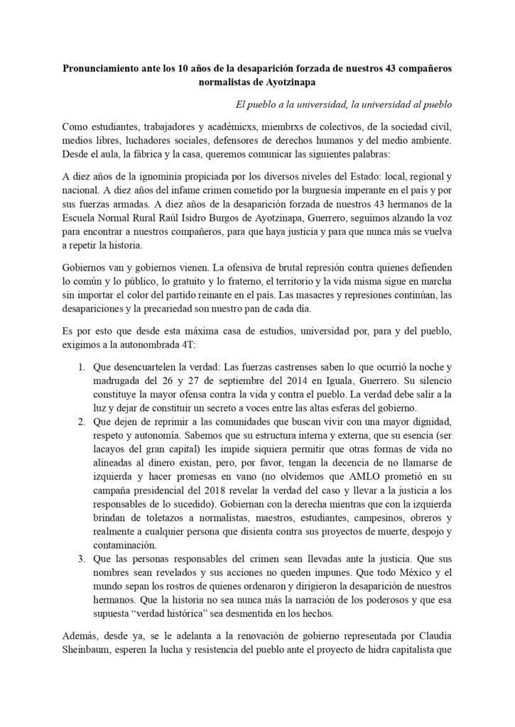 Los estudiantes también dieron lectura a su pronunciamiento con motivo de los 10 años de la desaparición de los 43 estudiantes de Ayotzinapa. En el documento se plasman las tres principales exigencias al gobierno de la Cuarta Transformación.