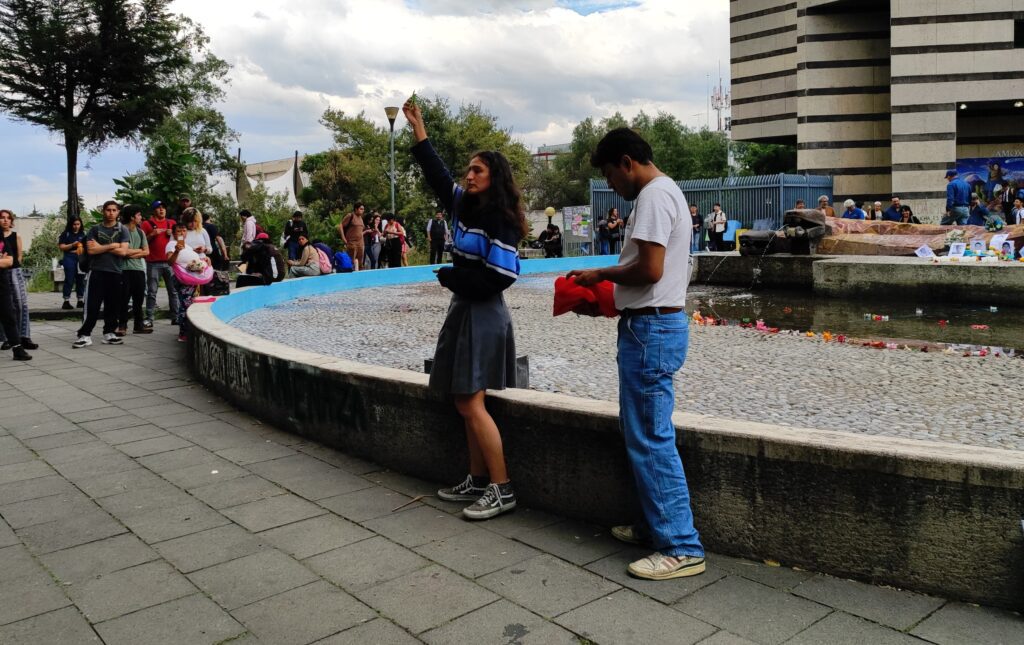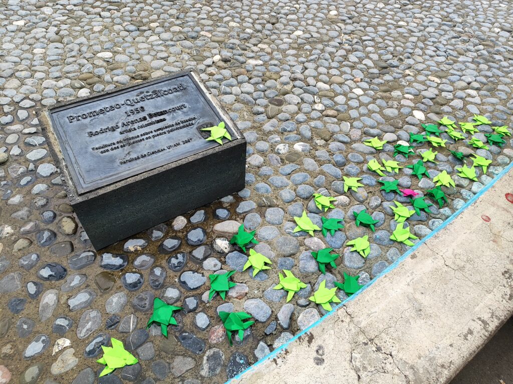 Uno de los homenajes consistió en liberar tortugas de origami sobre la fuente de la explanada de la Facultad de Ciencias. El símbolo que representa la lucha por encontrar a los 43 estudiantes es la tortuga, ya que Ayotzinapa, en náhuatl, significa “el lugar de las tortugas”.