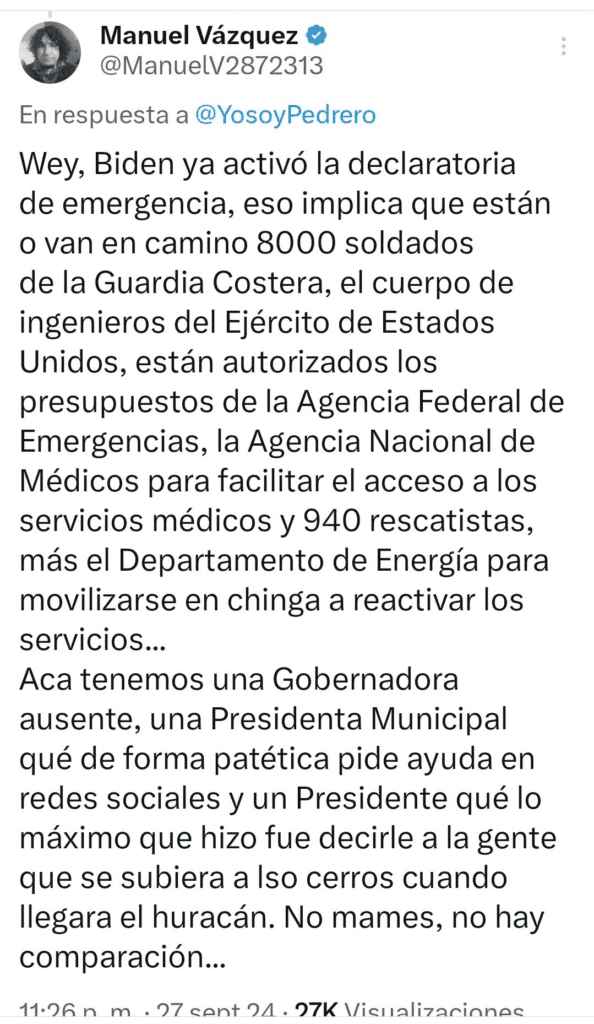 Un usuario de “X” hace un interesante comparativo de los recursos, el equipo y los elementos castrenses luego de emitir una Declaratoria de Emergencia para atender los daños ocasionados por el paso del huracán “Helene” en Miami, Florida, Estados Unidos esta semana; en comparación con nuestro país.