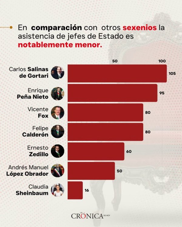 Asistieron diplomáticos de 23 organismos internacionales y de 105 naciones y solamente 16 jefes de Estado en funciones; la menor presencia de jefes de Estado a una toma de posesión de un mandatario mexicano en los últimos 30 años.