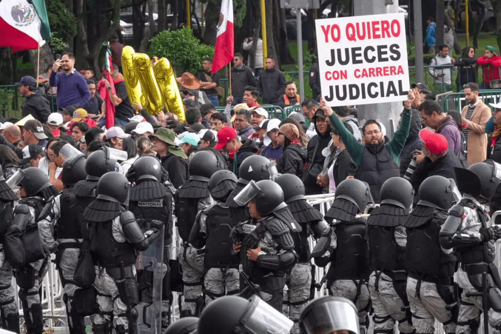 Mientras lo anterior acontecía, en las inmediaciones del Palacio Legislativo de San Lázaro, por lo menos mil trabajadores del Poder Judicial fueron cercados por militares vestidos de civil, integrantes de la Guardia Nacional y elementos de la Secretaría de Seguridad Ciudadana de la CDMX. La demanda era: !Diálogo, Claudia! !Diálogo, Claudia!