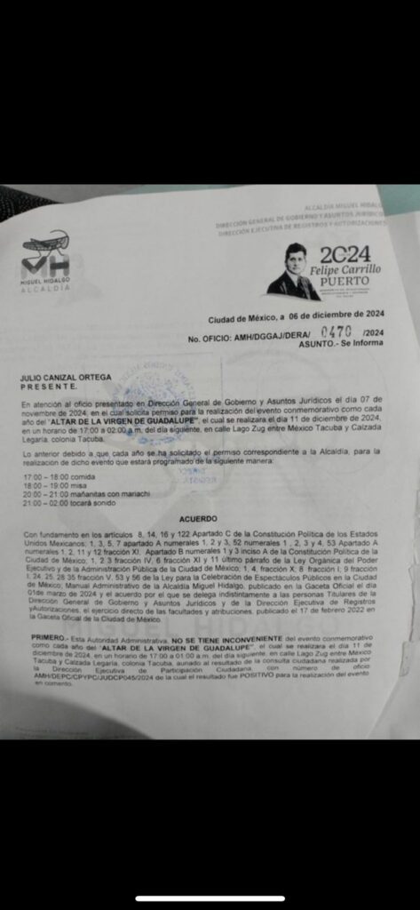 Una fotografía del permiso, emitido el 6 de diciembre y desacreditado por agentes de la SSC, menciona que el evento “Altar de la Virgen de Guadalupe” se realiza cada año. En esta ocasión, estaba programado para comenzar a las 17:00 horas con una comida, seguida de una misa, mañanitas con mariachi y, de las 21:00 horas a las 2:00 de la madrugada, un baile donde tocaría Sonido Condor.