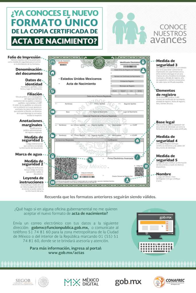 En México, hasta 1999 existían más de 196 formatos en las distintas oficialías del Registro Civil para la expedición de este documento. Sin embargo, en 2015 el Consejo Nacional de Funcionarios del Registro Civil (CONAFRE) aprobó un nuevo y único formato para la expedición y certificación de las actas de nacimiento.