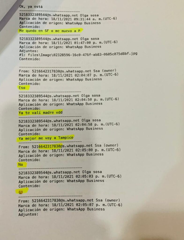 Por ejemplo, en una de las sábanas de las conversaciones, la del 18 de Noviembre del 2021, desde el número de Tampico adjudicado a Olga Patricia Sosa Ruiz le dice a Sergio Carmona Angulo a las 9:30 am, en una conversación previa a alguna reunión en la que se encontraría con el Rey del Huachicol: