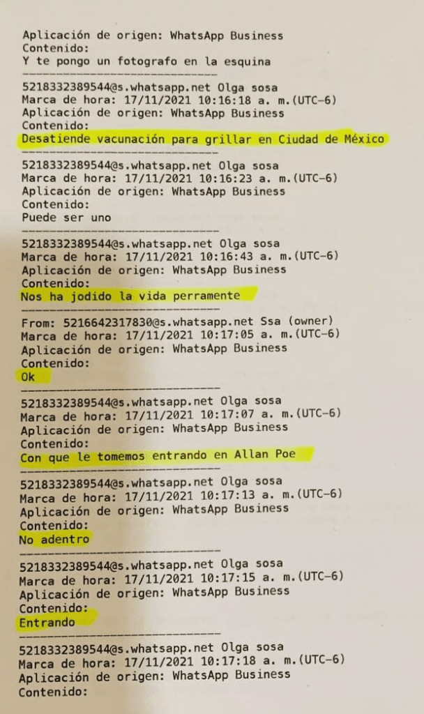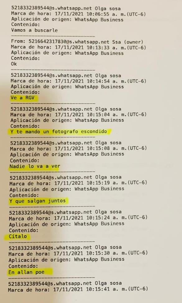 Le prometí a mis 3 lectores que publicaré los mensajes de WhatsApp que llegaron a mi redacción adjudicados a Olga Sosa con Sergio Carmona Angulo, desde luego que dicha lista de pláticas o “sábanas” está en manos de familia y de varias fiscalías como la de Nuevo León, donde asesinaron a “El Muñeco”, sin embargo, repito lo que dije en la otra entrega: