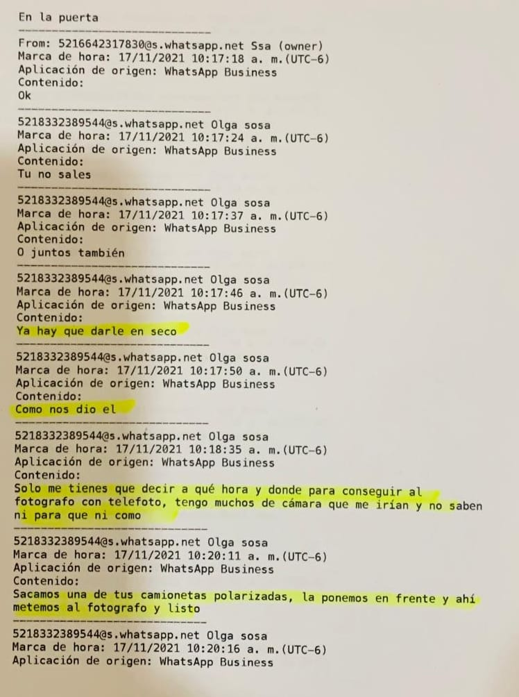 “Tú no sales, o salen juntos también. Hay que darle en seco como nos dio él a nosotros, solo me tienes que decir a qué hora y dónde para conseguir al fotógrafo con teléfoto, tengo muchos fotógrafos de cámara que irían y no saben ni para qué ni cómo… Sacamos una de tus camionetas polarizadas y la ponemos enfrente y ahí metemos al fotógrafo y listo”.
