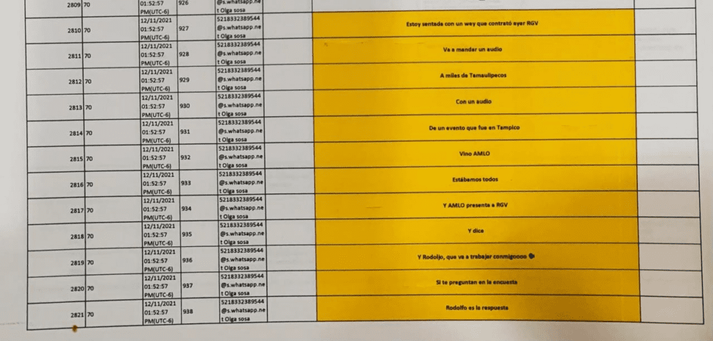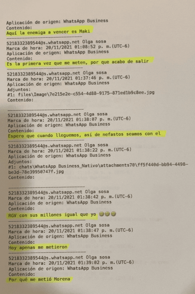 En uno de los mensajes Olga dice “Y espero que cuando lleguemos seamos igual de nefastos con él, RGV y sus millones .. hoy apenas me metieron porque me metió morena” -habla de meterse a la encuesta-.