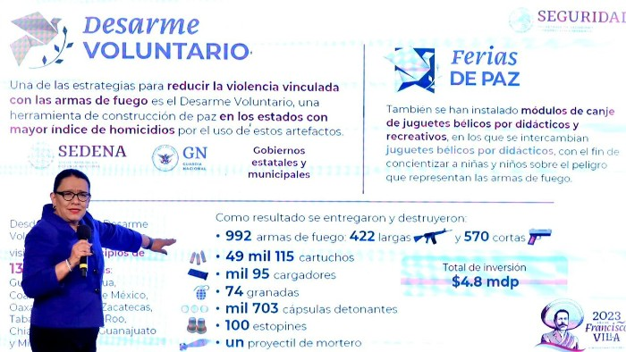 Según cifras oficiales (cifras de Rosa Icela, a saber), de 2012 a 2018, en la Ciudad de México, se lograron canjear más de 23 mil armas y 122 mil cartuchos y más de 15 mil juguetes bélicos por despensas, tabletas electrónicas y aparatos electrodomésticos, todo en coordinación con las delegaciones (ahora alcaldías), la Iglesia Católica, el Consejo Ciudadano de Seguridad Pública y Procuración de Justicia, la Secretaría de Seguridad Pública, el Ejército Mexicano y distintas dependencias del sector social.