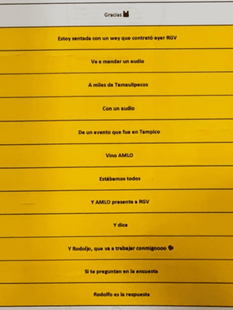 “Estoy sentada con un wey que contrató ayer Rodolfo González Valderrama (RGV), va a mandar un audio a miles de tamaulipecos de un evento que fue en Tampico a donde vino AMLO estaban todos … Y AMLO presenta a RGV y dice: “Y Rodolfo que va a trabajar conmigo … Si te preguntan en la encuesta Rodolfo es la respuesta”, dice indignada Sosa Ruiz a Carmona.