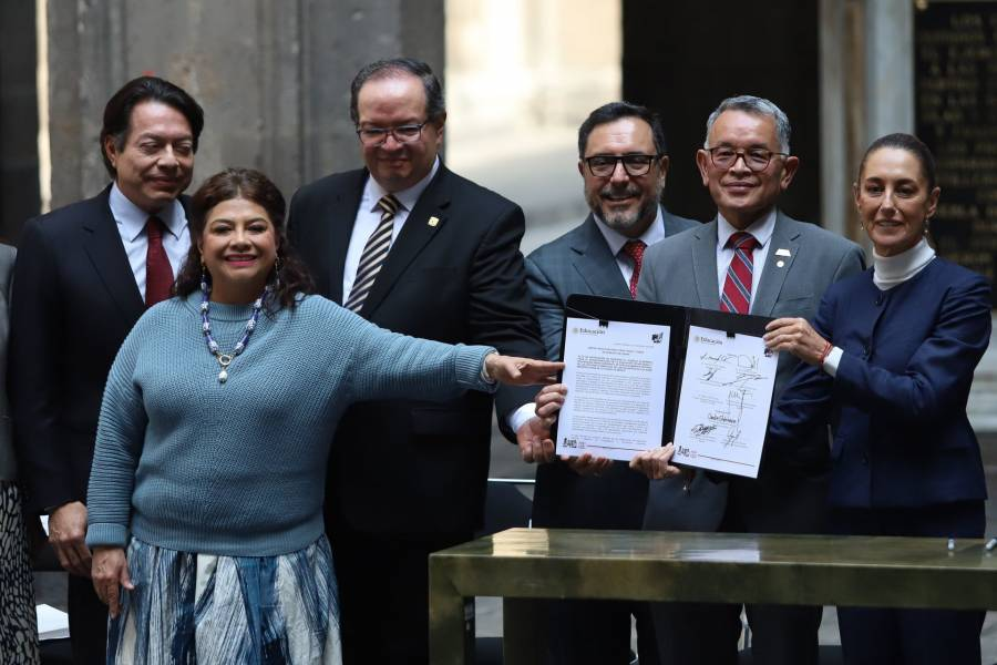 El secretario de Educación, Mario Delgado; la jefa de Gobierno de la CDMX, Clara Brugada; el rector de la UNAM, Leonardo Lomelí; el director general del Instituto Politécnico Nacional, Arturo Reyes Sandoval; el rector de la Universidad Autónoma Metropolitana (UAM), José Antonio de los Reyes Heredia; y la presidenta Claudia Sheinbaum en la presentación de la estrategia del Gobierno federal “Bachillerato Nacional para todas y todos ¡Mi derecho, mi lugar!
