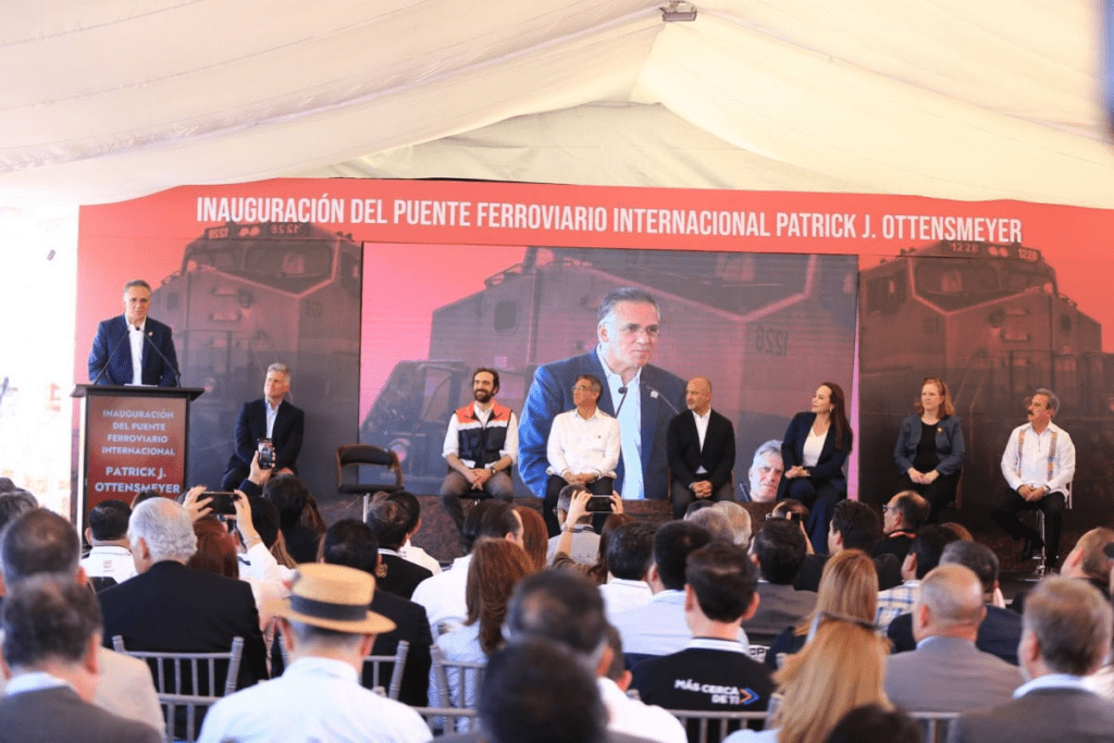 Nuevo Laredo. – El gobernador Américo Villarreal Anaya y el secretario de Infraestructura, Comunicaciones y Transportes, Jesús Antonio Esteva Medina, junto con directivos de la empresa Canadian Pacific Kansas City, inauguraron en esta ciudad el puente ferroviario internacional Patrick J. Ottensmeyer, que permitirá duplicar el intercambio comercial entre el corazón industrial de México con Estados Unidos y Canadá.