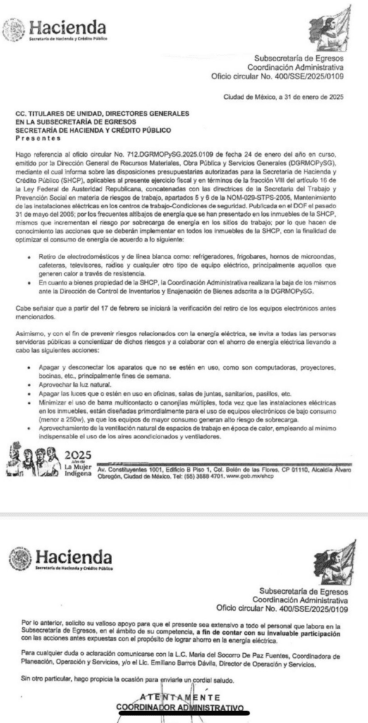 La Secretaría de Hacienda verificará la implementación de estas medidas, según la circular No. 400/SSE/2025/0109, por lo que se solicitó la colaboración de todo el personal para optimizar el consumo de energía en las instalaciones de la SHCP, siguiendo las siguientes acciones: