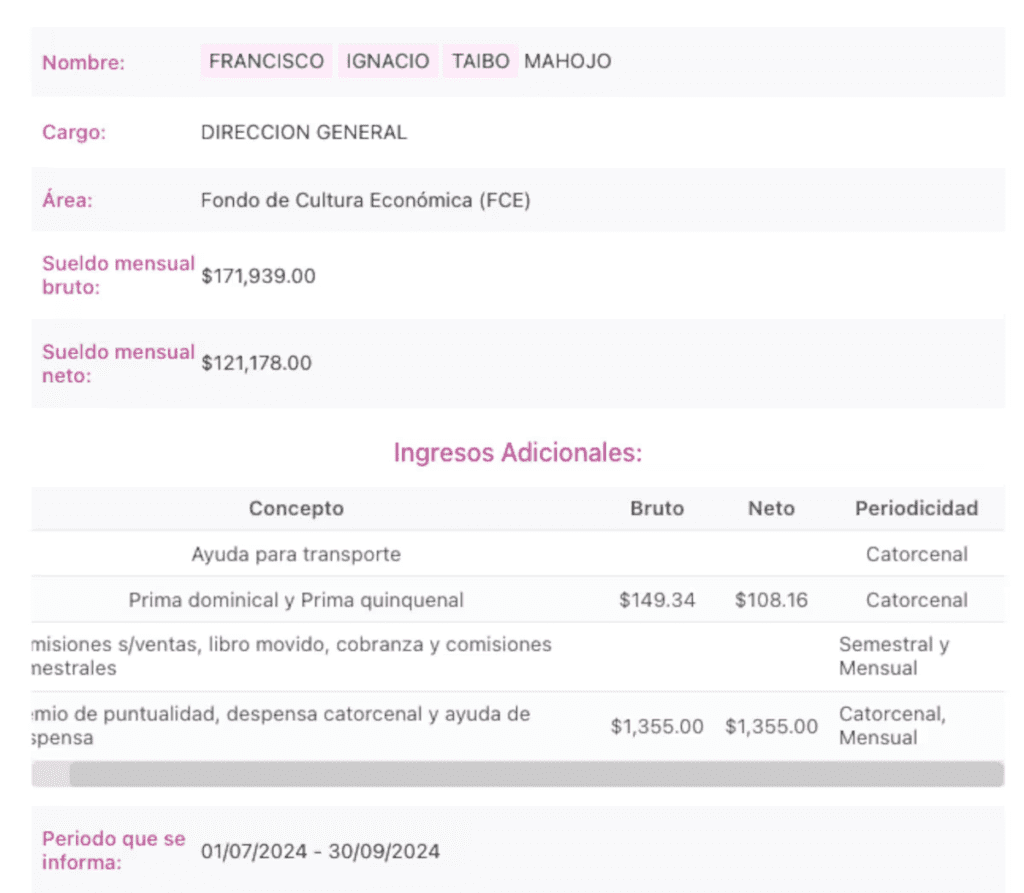 El director general del Fondo de Cultura Económica, Francisco Ignacio Taibo Mahojo, conocido como Paco Ignacio Taibo II, que después de un sexenio Claudia Sheinbaum lo ratificó para un nuevo periodo, percibe un sueldo bruto mensual de 171 mil 939 pesos, según el reporte del penúltimo trimestre (julio-septiembre) de 2024 que se encuentra publicado en la Plataforma de Transparencia. En 2019 percibía 97 mil pesos mensuales en el mismo cargo.