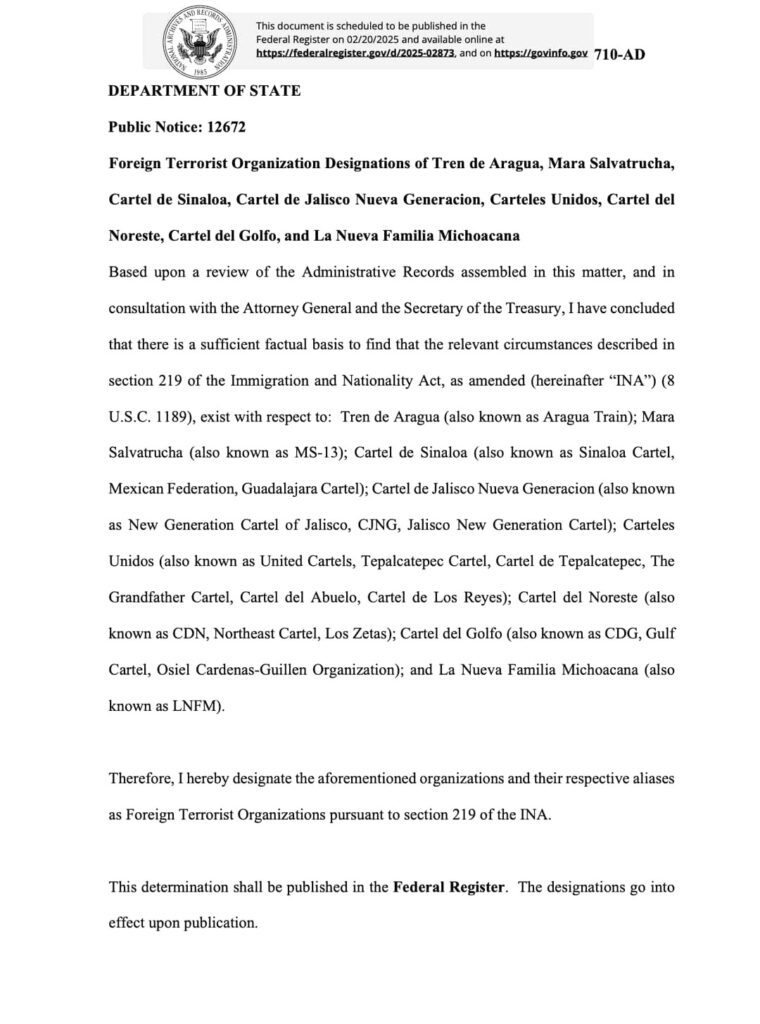 Los seis cárteles de las drogas que a partir de este 20 de febrero de 2025 son reconocidos por el gobierno norteamericano como una amenaza terrorista para la seguridad de Estados Unidos son El Cártel Jalisco Nueva General (CJNG), el Cártel Nueva Familia Michoacana (CNFM), el Cártel del Noreste (CN), El Cártel de Sinaloa (CS), el auto llamado Cárteles Unidos (CU) y el Cártel del Golfo (CDG).