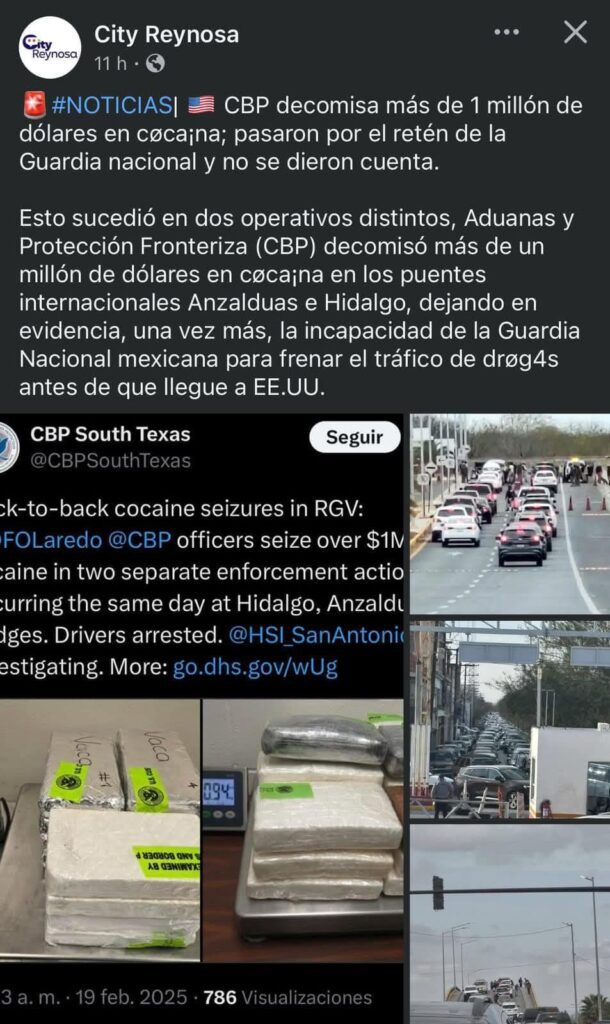 El plazo se agotará con un millón de dólares en cocaína incautada por el CBP, ayer en los puentes Hidalgo y Anzaldúa, demostrado la incapacidad de los 10,000 elementos de la Guardia Nacional que solo aletarga con revisiones “minuciosas” hasta por 8 horas el paso hacia los puentes internacionales, es decir, que el contrabando pasó por la “exhaustiva revisión”.