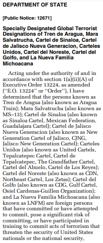 El pasado 19 de febrero, Donald Trump designó como organizaciones terroristas a seis cárteles mexicanos: el Cártel Jalisco Nueva Generación (CJNG), el Cártel de Sinaloa, Cárteles Unidos, el Cártel del Golfo y la Nueva Familia Michoacana (NFM). Con esta medida, generó la expectativa de combatir el narcotráfico sin abordar el problema del consumo dentro de su país ni actuar contra las organizaciones que distribuyen las drogas provenientes de los cárteles mexicanos. La designación, sin embargo, ha servido como parte de su estrategia demagógica, poniendo al gobierno de México en una posición comprometida.
