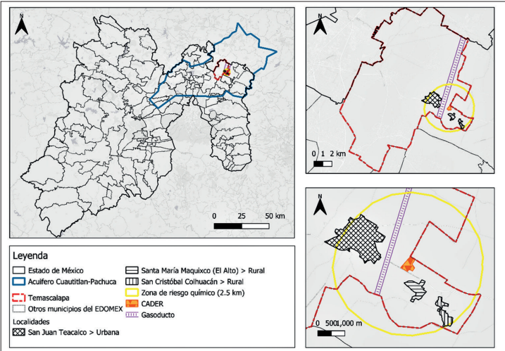 El estudio de Castillo Oropeza y Delgado Hernández evidencia otro peligro, ya que estas comunidades se encuentran en una zona de riesgo químico de 2.5 km de diámetro a partir del CADER y en la ruta de un gasoducto subterráneo de Petróleos Mexicanos (Pemex) que cruza el área.