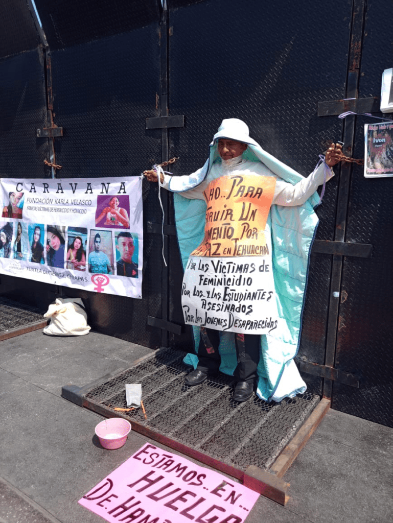 A pleno rayo del sol quemante de mediodía en la plancha del Zócalo de la Ciudad de México, mientras Maricruz Nieto explicaba que la Fundación Karla Velasco trae 11 carpetas investigación de feminicidios en el estado de Chiapas, cubría la boca del señor Víctor Manuel Cárdenas con cinta plástica y lo ayudaba “crucificarse” sobre las vallas metálica con pedazos de rafia.
