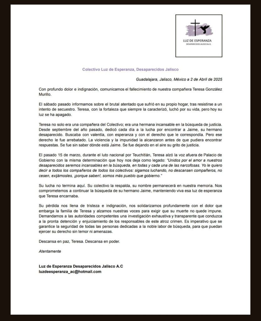 El 2 de abril, el Colectivo Luz de Esperanza, Desaparecidos Jalisco, anunció a través de un comunicado que Teresa González Murillo, buscadora del colectivo, falleció tras haber permanecido entre la vida y la muerte desde el 27 de marzo, luego de que un delincuente le disparara en la cabeza al resistirse a un presunto intento de secuestro ocurrido en su propia vivienda.