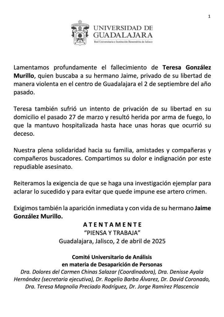Por su parte, el Comité Universitario de Análisis en Materia de Desaparición de Personas de la Universidad de Guadalajara se solidarizó con la familia, amigos y compañeros de Teresa González y reiteró “la exigencia de que se haga una investigación ejemplar para aclarar lo sucedido y para evitar que quede impune ese artero crimen”.