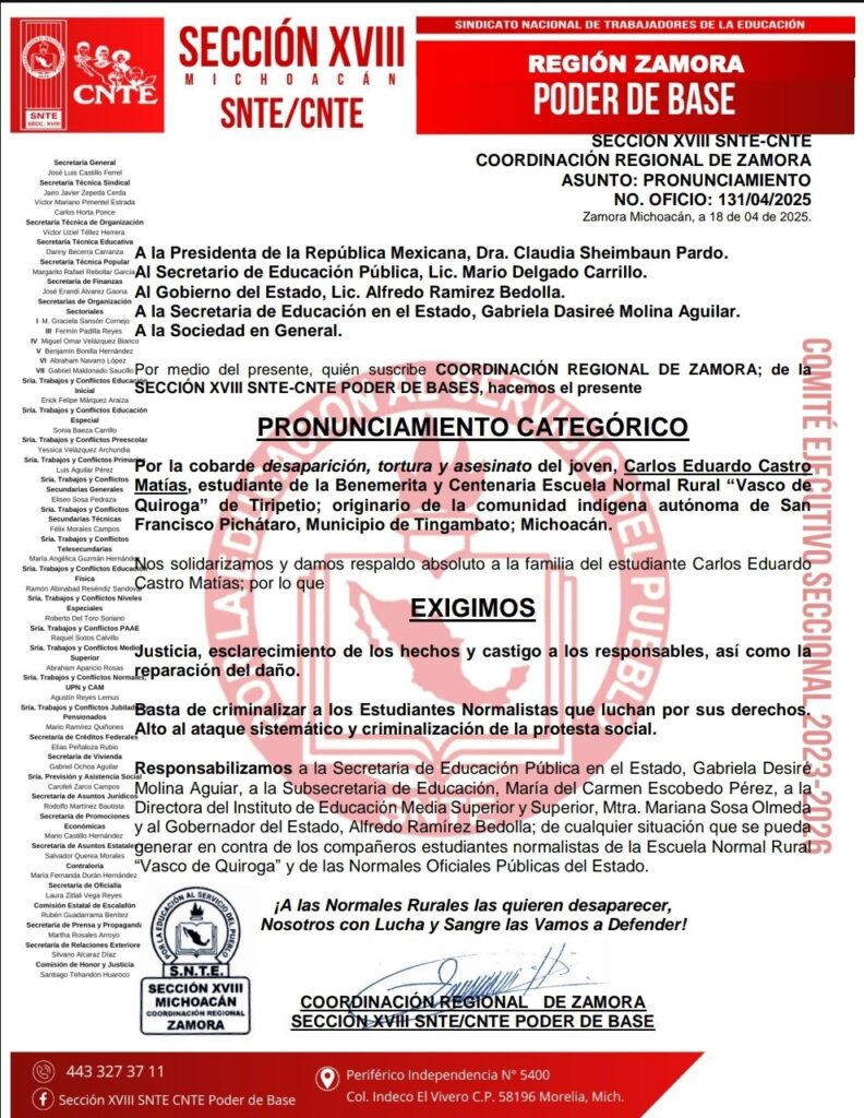 Por su parte, el Magisterio Democrático de la Sección XVIII SNTE-CNTE Poder de Base de la región Zamora denunció la desaparición, tortura y asesinato del estudiante Carlos Eduardo Castro, originario de la comunidad indígena autónoma de San Francisco Pichátaro, municipio de Tingambato, Michoacán. Además, exigió justicia, el esclarecimiento de los hechos y castigo a los responsables.