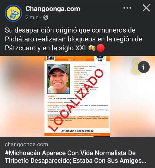 Este mismo medio digital difundió información falsa, afirmando que Carlos Eduardo había sido localizado y que se encontraba con sus amigos. También criminalizó los bloqueos realizados por amigos, compañeros y familiares en Pátzcuaro, quienes exigían la actuación oportuna de las autoridades. Sin embargo, contrario a esa versión, el joven estudiante no había sido localizado hasta este viernes.