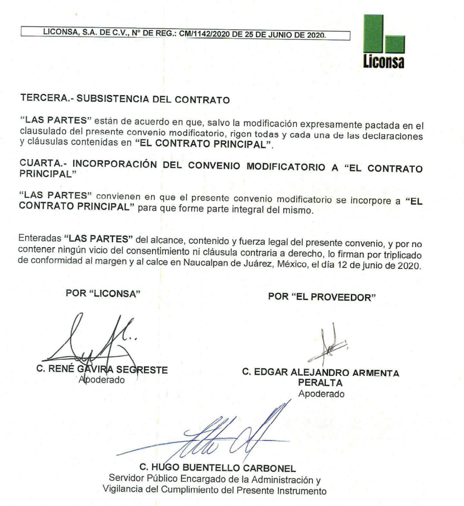 MCCI en un reportaje de septiembre de 2023 expuso que Buentello Carbonell como subdirector de Operaciones de Liconsa, encargada de la industrialización y distribución de leche en el país, firmó: