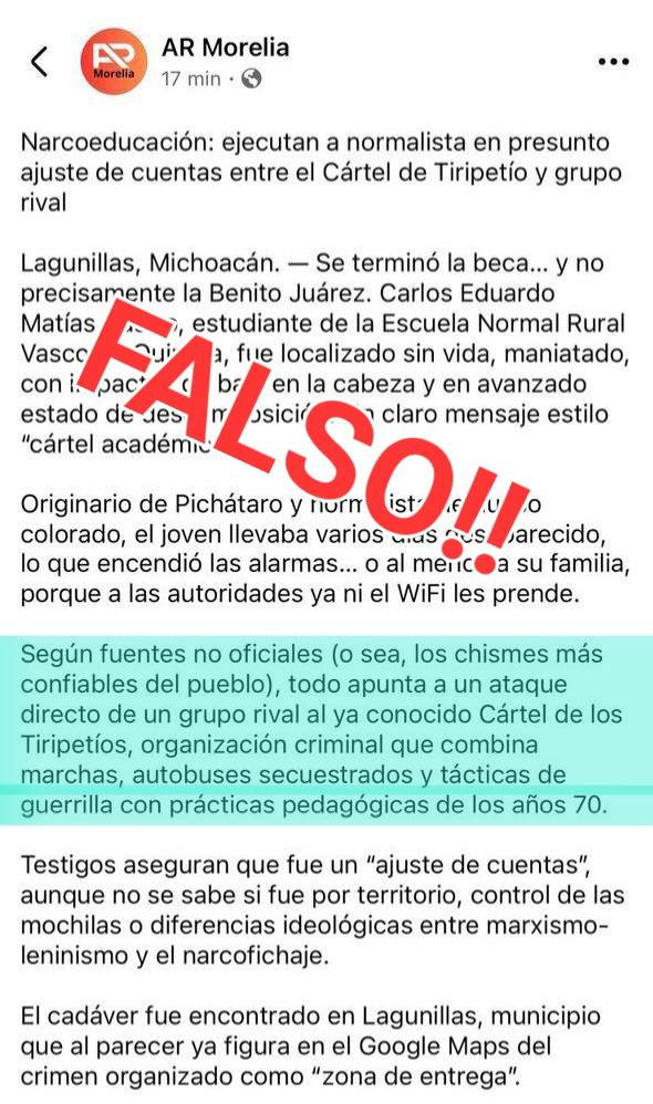 La Escuela Normal Rural Vasco de Quiroga (ENRVQ), a través de la Prensa Benemérita y Centenaria ENRVQ Tiripetío, denunció que medios digitales y prensa del estado han emprendido una campaña de desinformación, odio y desprestigio, a raíz del asesinato del normalista Carlos Eduardo Castro Matías, quien fue hallado sin vida, maniatado y con un disparo en el cráneo el pasado 18 de abril. Carlos se encontraba desaparecido desde el domingo 13 de abril de 2025.