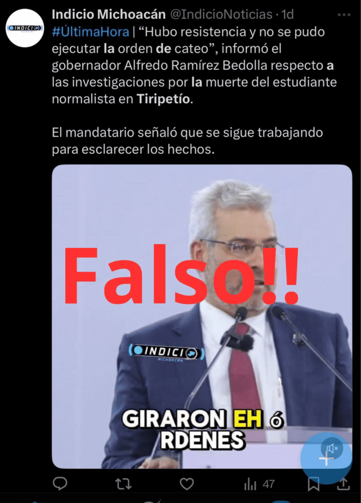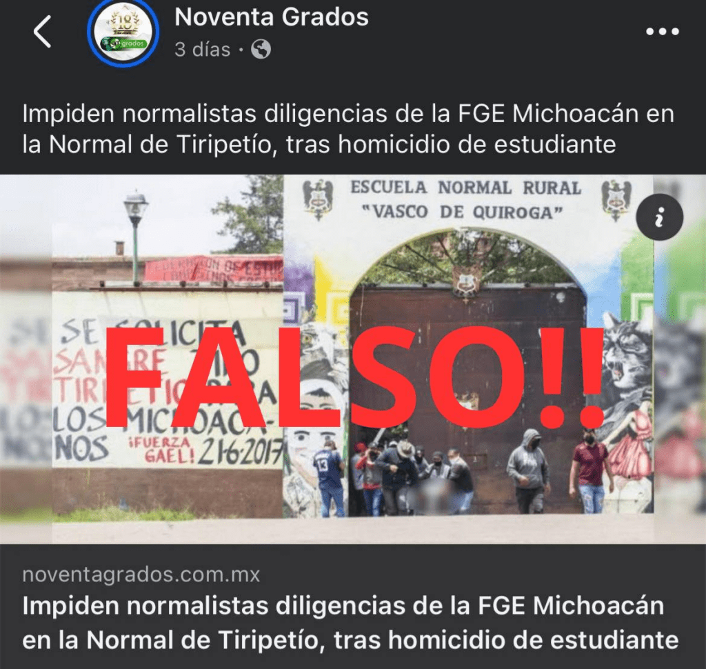 Tres medios presentaron este falso discurso que, en palabras de la ENRVQ, proviene de las autoridades estatales. Se trata del medio AR Morelia, que afirma que, a través de “los chismes más confiables del pueblo”, todo apunta a un ataque directo de un grupo rival al ya conocido Cártel de los Tiripetíos. Sobre esta misma línea de revictimización y descrédito a la Normal, el medio Noventa Grados asegura en sus titulares que los estudiantes normalistas impidieron las “diligencias de la FGE”, respaldo que también ofrece el medio Indicio Michoacán, el cual cita al gobernador Alfredo Ramírez Bedolla, quien aseguró que una orden de cateo no pudo ser realizada en la Normal, pues hubo resistencia.