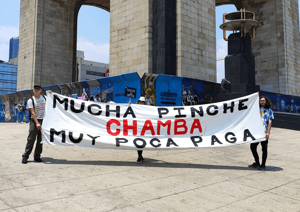Unos minutos después de las 10:20, los trabajadores, activistas y la sociedad en general comenzaron la marcha con dirección al Monumento a la Revolución. En el paso frente al Palacio de Bellas Artes relució un cartel donde se leía: “El arte también es trabajo”, una exigencia de respeto a los derechos laborales de los artistas, cuyo trabajo muchas veces es menospreciado, sobre todo por quienes no forman parte de la élite académica y económica del país.