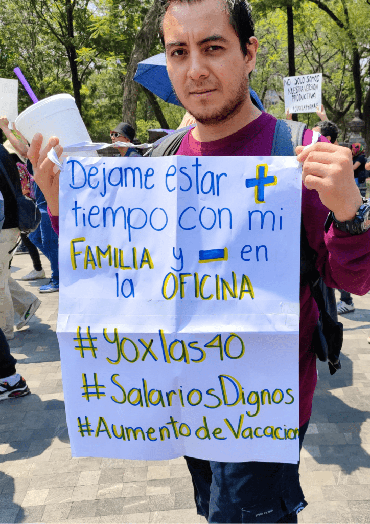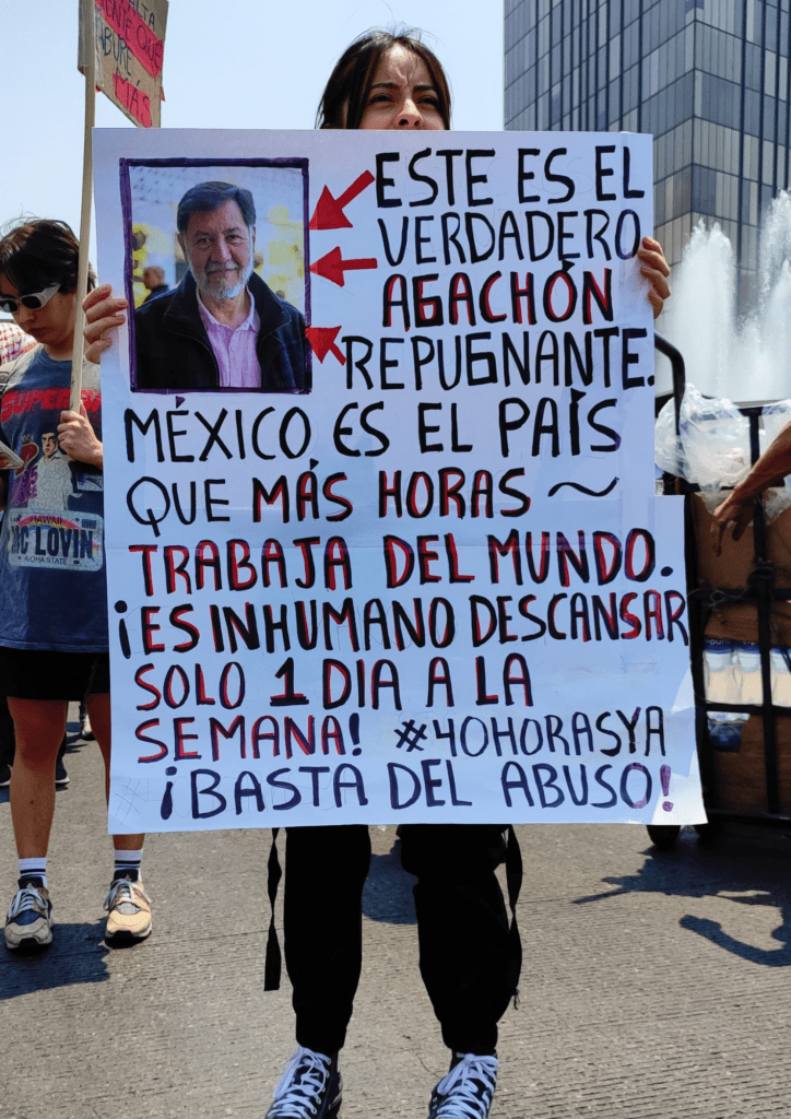 En entrevista para Cenzontle400.MX, una manifestante que nos pidió ser llamada Laura manifestó la necesidad de que la reforma para la reducción de la jornada laboral se apruebe pronto, pues se trataría de la punta de lanza que podría permitir “verdaderamente revolucionar los derechos laborales en México”, ya que “somos el país que más horas trabaja, que menos descansa y que menos gana por esas horas”.