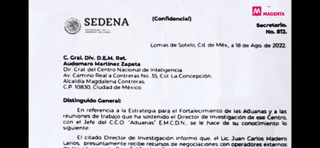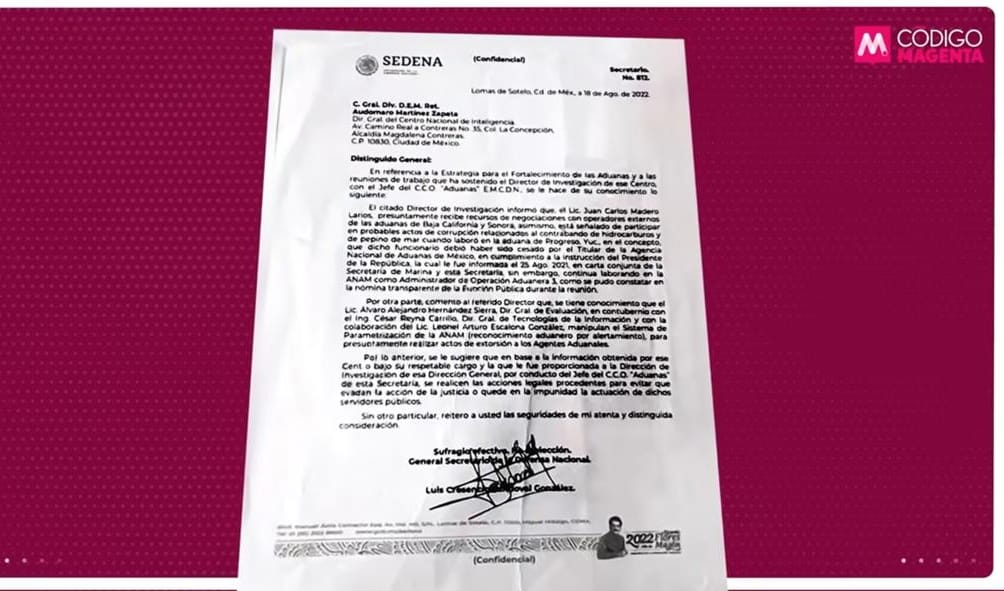 Otra vez los medios de comunicación son verdadera oposición, en este caso, Código Magenta,puso en jaque a la evidentemente próxima Presidenta del Supremo Tribunal de Justicia, Tania Contreras, a su marido y a su cuñado Juan Carlos Madero Larios, quien es señalado en una carta donde se pedía su dimisión del Servicio de Aduanas por el general Luis Crescencio Sandoval, titular de la Defensa Nacional, de ese momento, quien le exigió en dicha misiva a Audomaro Martínez Zapata, el cese inmediato del cuñado de Tania el 22 de agosto del 2022.