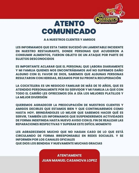 Esperemos que las investigaciones en torno al caso sean claras y específicas, que no salgan con temas de extorsión o robo, sino que se nos aclare a la ciudadanía en general los motivos reales e identidades de los agresores, pero sobre todo que se pida apoyo a la federación para vigilar la ciudad y el estado, ya que tenemos una policía que está en entre dicho.