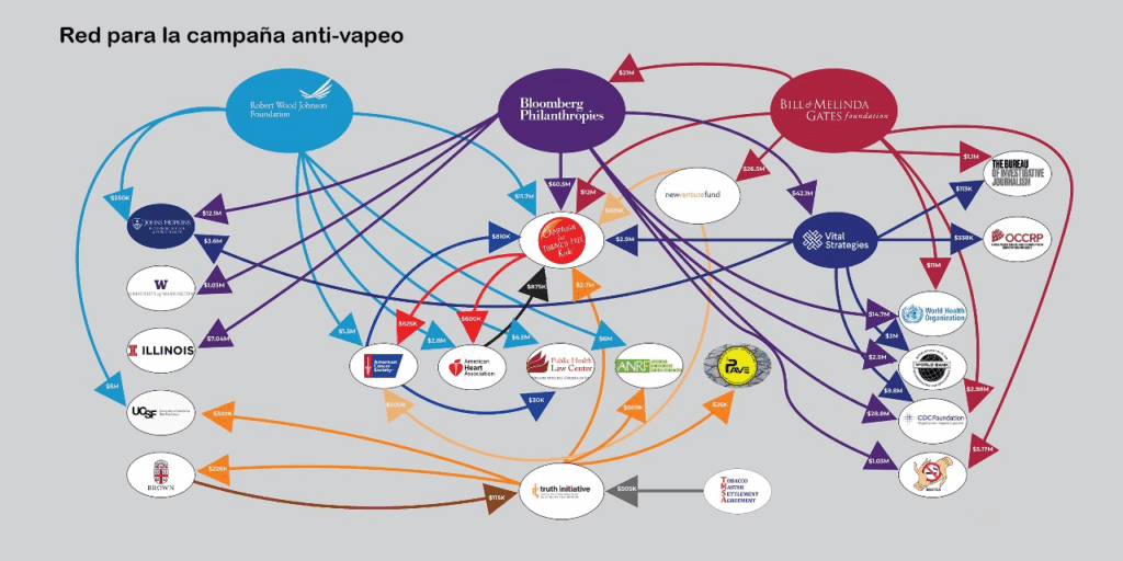 Pero en los últimos años, su enfoque se ha dirigido con fuerza hacia los cigarrillos electrónicos o vaporizadores. Su fundación ha apoyado, con millones de dólares, a organizaciones que promueven prohibiciones totales del vapeo en países de ingresos medios y bajos. Algunas de estas ONG, como The Union1, Vital Strategies2 y Campaign for Tobacco Free Kids3, han influido directamente en la legislación de países como India4, Filipinas5 y México6.