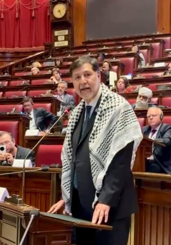 Durante la Segunda Conferencia Parlamentaria sobre Diálogo Interreligioso del Parlamento Europeo, celebrada en Roma, el presidente del Senado, Gerardo Fernández Noroña, se posicionó frente al genocidio en Gaza cubierto con una kufiya, prenda simbólica del pueblo palestino.