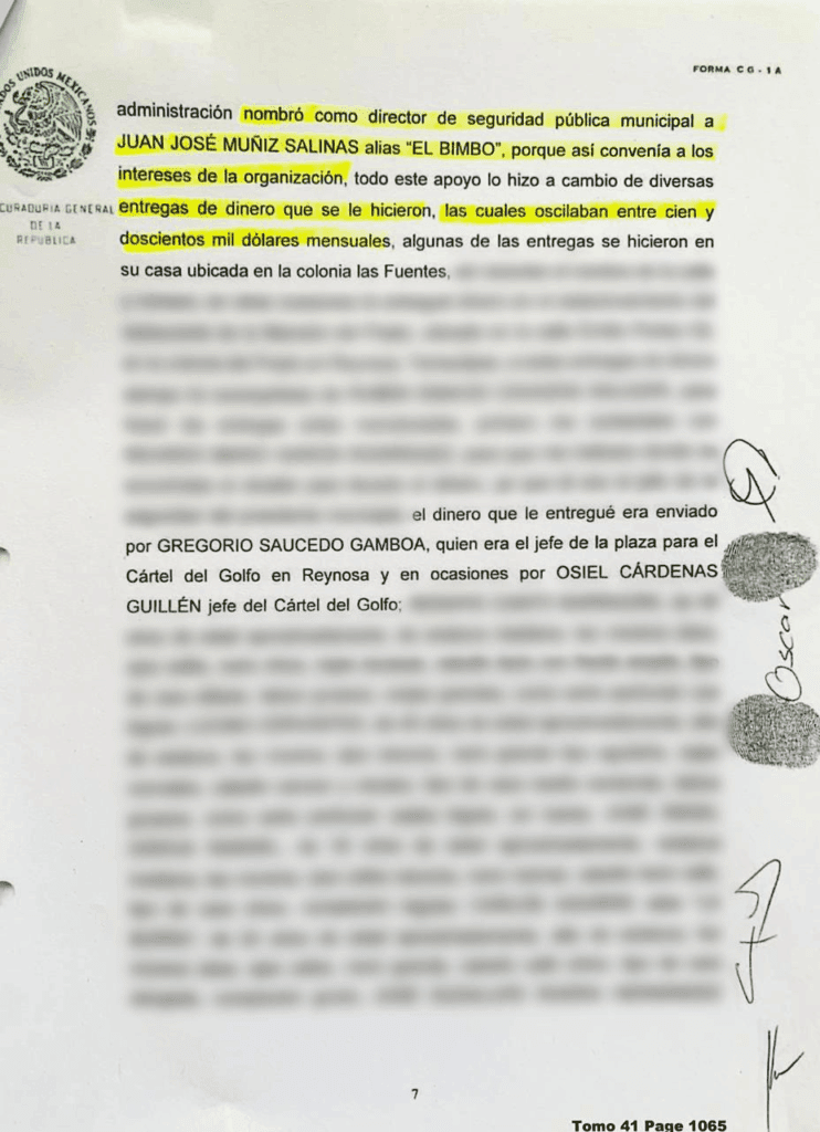 Según las acusaciones del testigo protegido llamado “Oscar”, el cargo de Muñiz Salinas era sostenido por los entonces líderes del Cártel, tanto el local como el de Matamoros, porque obedecía a una entrincada red criminal en la cual obviamente, “El Bimbo” tenía la encomienda de vigilar y proteger los intereses de la organización hoy terrorista.