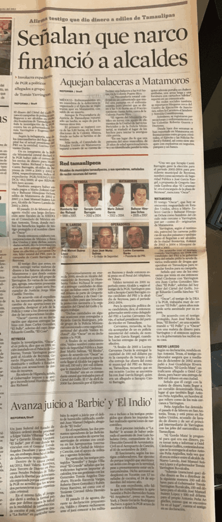 “Valdez Richaud en el tiempo que estuvo colaborando con la organización del cartel del golfo, brindadole protección durante su gestión como presidente municipal pues nombraba los directores de policía y comandantes que el cartel sugería, entre ellos Juan José Muñiz Salinas, alias “El Bimbo” también añadió que algunas entregas se hacían en su casa del fraccionamiento Las Fuentes en Reynosa, que algunas veces era el mismo Osiel Cárdenas Guillén quien lo enviaba, pero por lo general el encargo financiero lo gestionaba Gregorio Sauceda, “el Goyo”, líder criminal de la plaza y por cierto consuegro de la actual Diputada local por Morena Eva Reyes, quien desde luego hará sus intentos por ocupar la tan preciada silla narcofinanciada y narco sostenida de Reynosa,Tamaulipas.