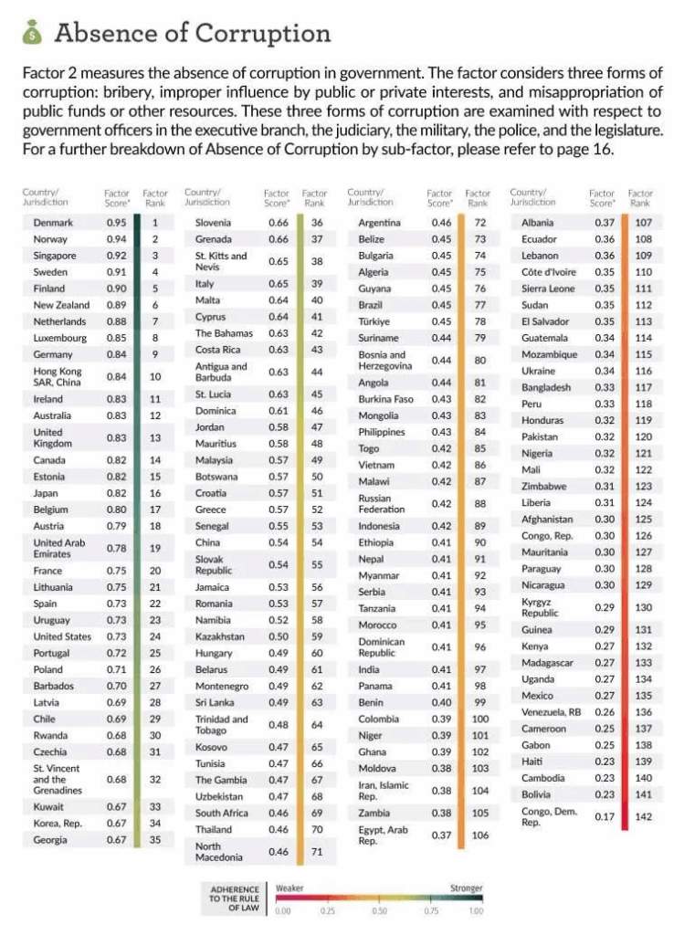 El Índice del Estado de Derecho del WJP, Factor 2, evalúa tres formas principales de prácticas corruptas: soborno, influencia indebida de intereses públicos o privados, y malversación de fondos públicos o recursos gubernamentales.