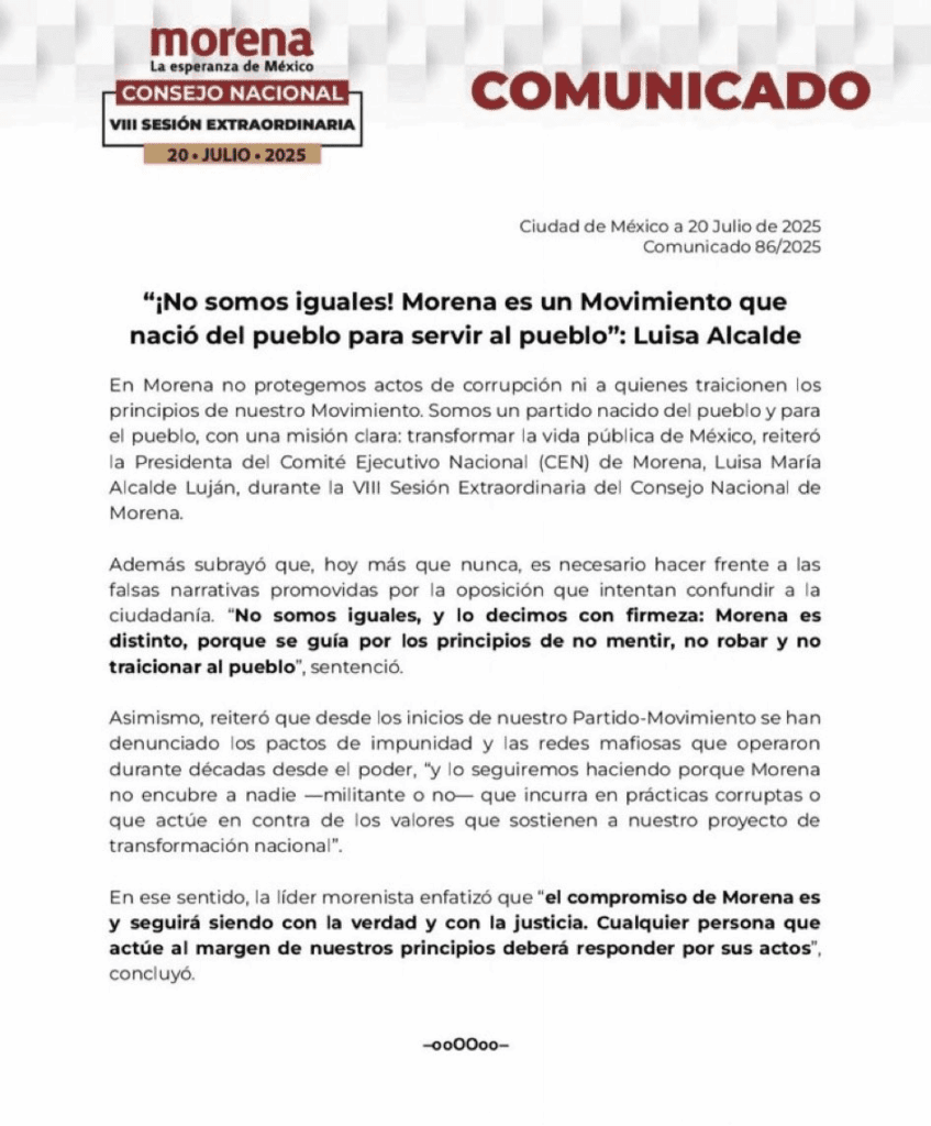 “No, compañeras y compañeros. Que se escuche fuerte y claro: ¡no somos iguales! Morena es un movimiento que nació del pueblo para servir al pueblo. Surgimos para transformar la vida pública de México, desterrar la corrupción y construir una nación más justa, con bienestar y dignidad”.