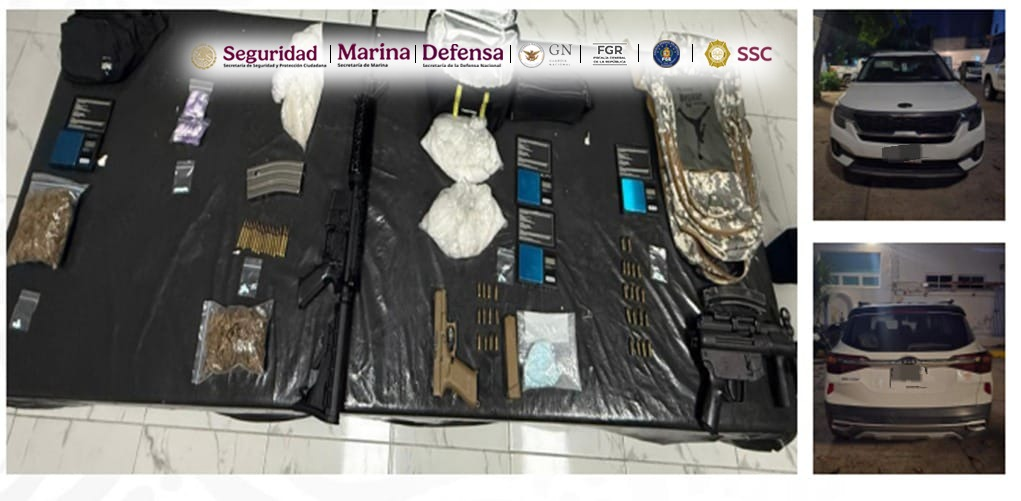A los detenidos, Carlos “N”, alias “El Cabezas” de 42 años, Ricardo “N” alias “El Frijol” de 36 años, Brayan “N” alias “Cuartito” de 28 años y José “N” de 31 años, se les aseguraron un vehículo, tres armas de diferentes calibres, 51 cartuchos útiles, cuatro básculas, 80 dosis de posible cristal, 50 gramos de pastillas que al parecer contenían fentanilo, tres bolsas de medio kilo de aparente cristal, y dos bolsas de probable marihuana con 165 gramos en total.