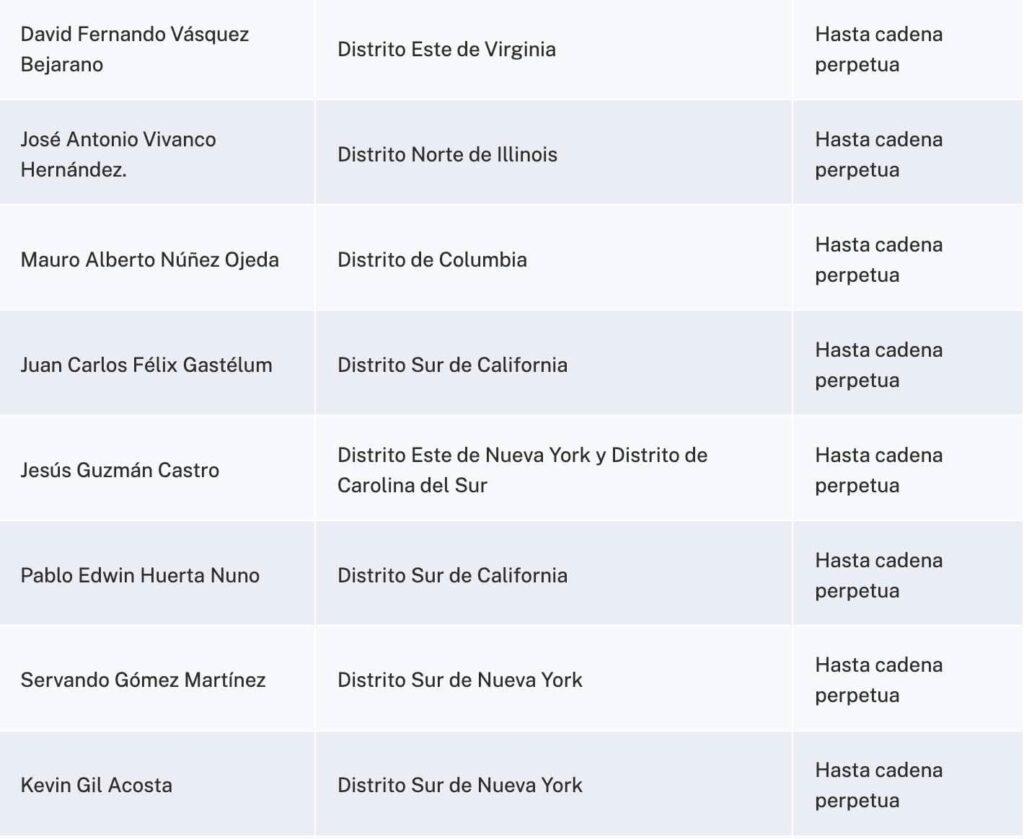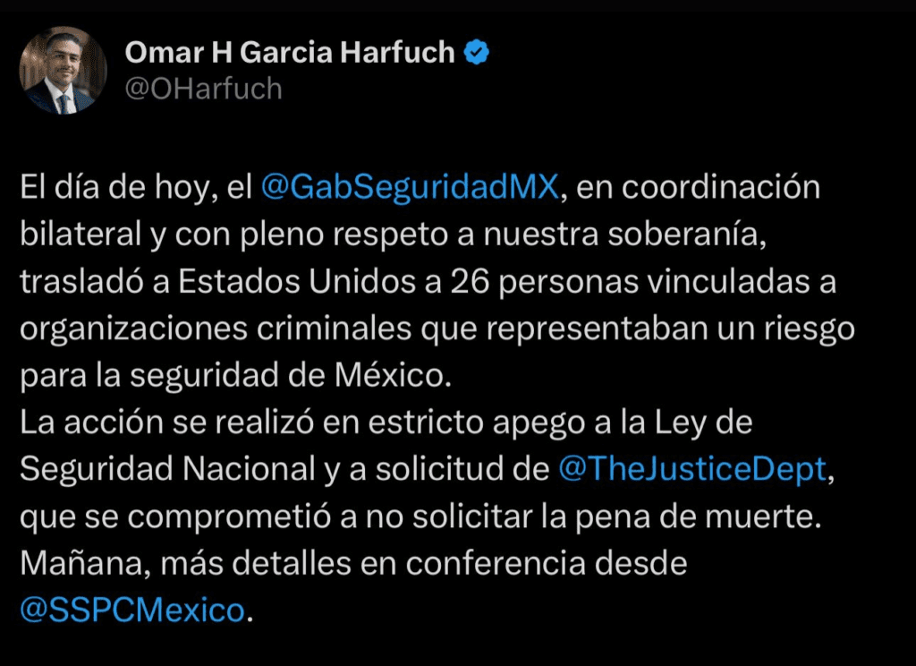 La Fiscalía General de México y la Secretaría de Seguridad confirmaron los traslados, que se llevaron a cabo tras la promesa del Departamento de Justicia de Estados Unidos de que los fiscales no solicitarían la pena de muerte en ninguno de los casos.